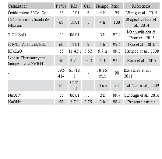En la tabla 6 se resumen condiciones de operación para diversos estudios usando aceite de palma crudo y refinado, aplicando diversos procesos tecnológicos con la intención de obtener rendimientos de biodiesel adecuados. También se ha explorado la obtención del combustible a través de procesos en condiciones supercríticas, observándose que aunque en cada uno se reportan rendimientos aceptables no existe una optimización de condiciones de operación de este proceso. En cuanto al uso de catalizadores enzimáticos, la relación molar es menor, pero es inadecuado comparar el porcentaje de catalizador y tiempos de reacción, los cuales tienen valores elevados con respecto a todos los demás estudios (Raita, Arnthong, Champreda & Laosiripojana, 2015).