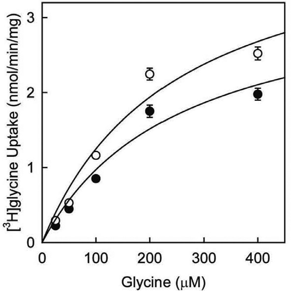 Cells were incubated with vehicle (DMSO, white circles) or 1 μM PMA (black circles) for 1 h, followed by determination of glycine uptake. The assay was performed in presence of increasing concentrations of cold glycine (25 μM – 400 μM) in a buffer with a constant concentration of 4 μCi/ml of [3H] glycine at 37 ºC. Kinetic parameters were calculated using the Michaelis-Menten equation and Sigma Plot 10. Values represent mean of 4 independent determinations ± SE (Vargas-Medrano, Castrejón-Téllez, Plenge, Ramírez & Miranda, 2011).