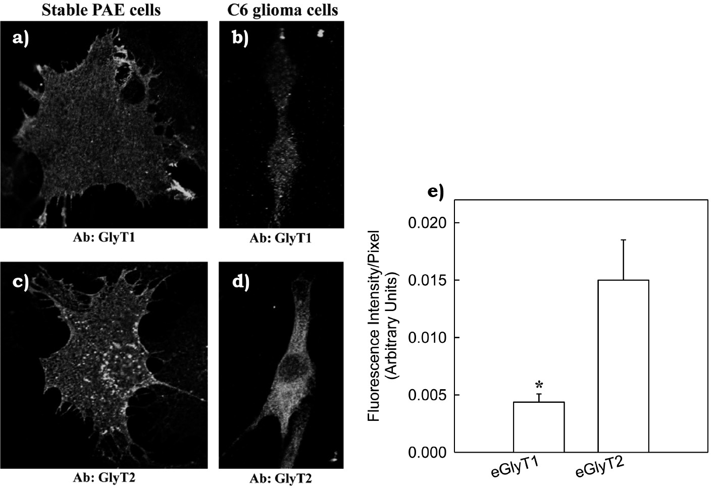 Immunofluorescence staining of GlyT1 (a) or GlyT2 (b) with selective antibodies in C6 glioma cells is shown. As positive controls, PAE cells stably expressing FH-GlyT1 (c) and FH-GlyT2 (d) were immunostained and are shown in corresponding panels. In panel e, a quantitative plot of fluorescence intensity by C6 glioma cells for staining of endogenous GlyT1 and GlyT2 is shown indicating that endogenous GlyT2 (eGlyT2) is expressed in higher amounts when compared to endogenous GlyT1 (eGlyT1). Bars represent the mean ± SE, n = 10, *p = 0.025 when compared to eGlyT2 (Vargas-Medrano et al., 2011).
