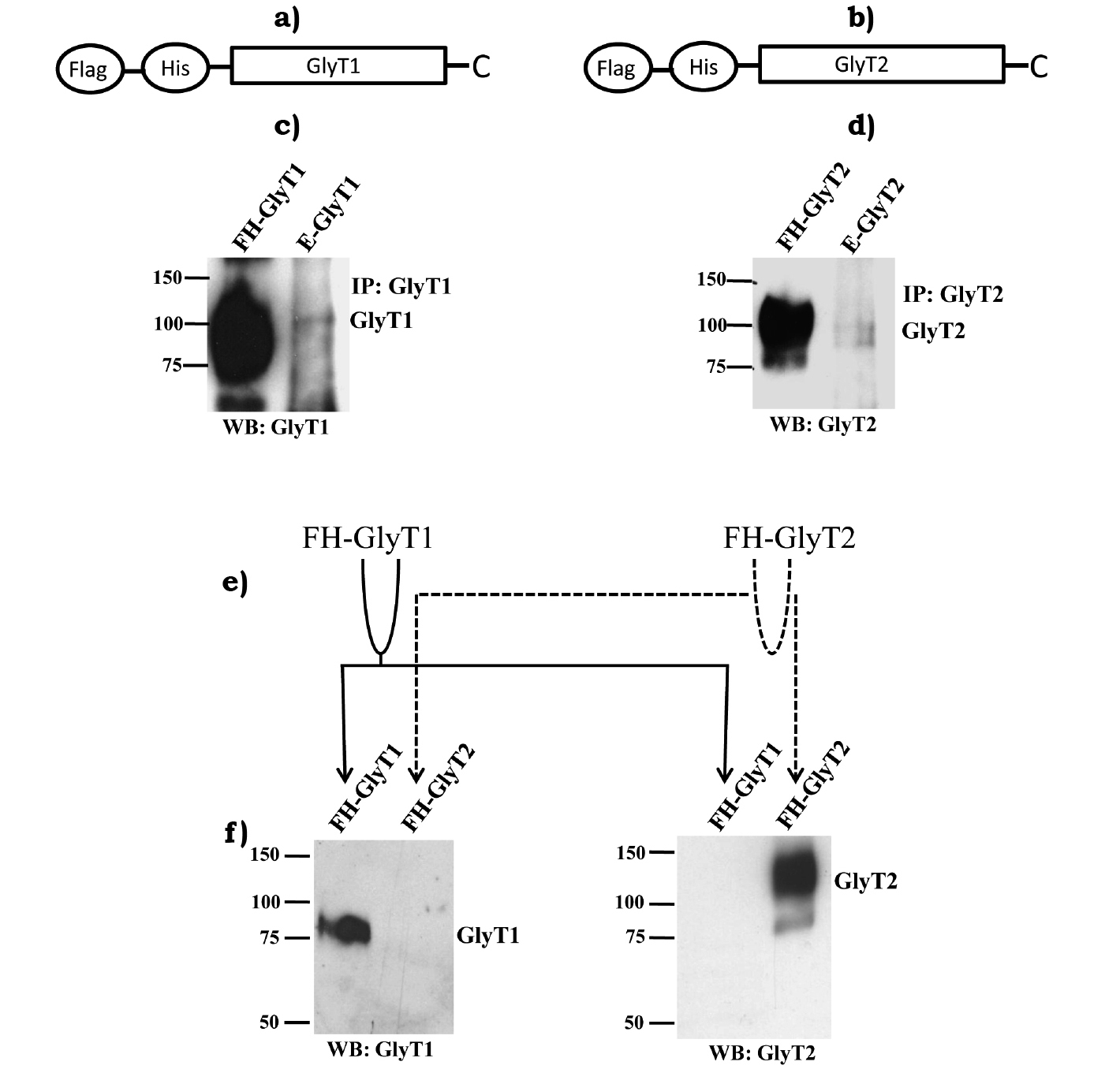 Schematic representations of N-terminal Flag, His-tagged GlyT1 (a) and GlyT2 (b) are shown. FH-GlyT1 (c) and FH-GlyT2 (d) were purified from PAE cells in a 60 mm tissue culture dish and loaded as positive controls in the first lane of each western blot. Immunoprecipitated GlyT1 and GlyT2 from C6 glioma cells grown on a 100 mm tissue culture dish were loaded in second lane. Antibodies selectivity was validated by purifying FH-GlyT1 and FH-GlyT2 using double affinity chromatography (e) as described in methods. Purified proteins were spread into two western blots (f). As shown, antibodies were highly-selective for detecting FH-GlyT1 and FH-GlyT2. Solid lines follow GlyT1 and dotted lines follow GlyT2 (Vargas-Medrano et al., 2011).