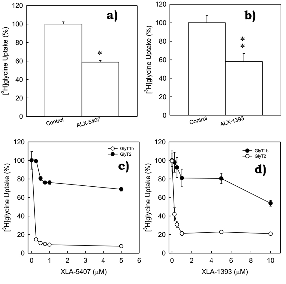Glycine uptake from untreated cells was normalized to 100% of glycine uptake and selective inhibitors (a) 0.25 μM ALX-5407 (inhibitor to GlyT1) or (b) 0.75 μM ALX-1393 (inhibitor to GlyT2) significantly inhibited glycine uptake mediated by C6 glioma cells. *p = < 0.001, **p = 0.003 compared to control (untreated cells). Bars represent the mean ± SE, n = 8. GlyT1 or GlyT2 selective inhibitors were further validated by performing dose-response curves with ALX-5407 (c) or ALX-1393 (d) using stable cell lines expressing GlyT1 or GlyT2. Point values represent mean ± SE, n = 4. (Vargas-Medrano et al., 2011).