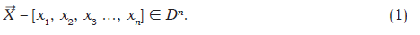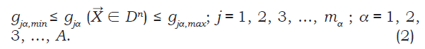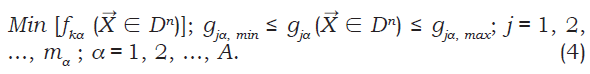 Donde el vector X_ es conformado por las variables genéricas x1, x2, … xn, las cuales pertenecen al espacio de diseño Dn. Dichas variables tienen límites inferiores y superiores que se relacionan con limitaciones físicas, económicas o de diseño; un diseño se considera factible si cumple la condición en la cual todas las variables se encuentran dentro de los límites del diseño.