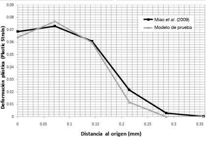 Los resultados de la deformación plástica fueron comparables con los de dicha referencia, ya que cuenta con los datos necesarios para reproducir la simulación del impacto de una esfera y están correlacionados con una prueba experimental. En la figura 2 se comparan los resultados del modelo de referencia con los obtenidos. El factor de correlación entre las curvas es de 0.992.