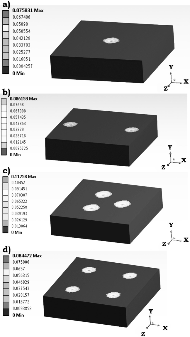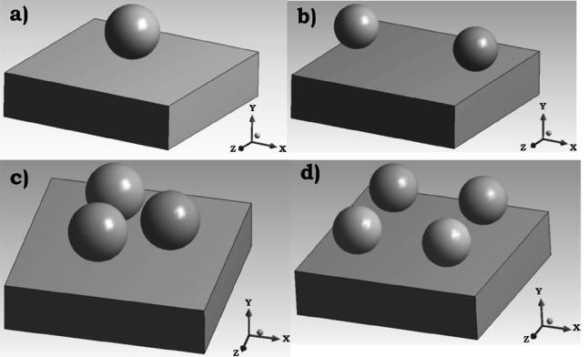 Una vez validado el método de simulación, se procedió a la optimización mediante el uso de superficies de respuesta en el módulo DesignXplorer contenido en ANSYS Workbench®. Para tal fin, se repitió el análisis de una placa que es golpeada por una esfera, como se muestra en la figura 3a. Posteriormente, se generó una serie de modelos con dos, tres y cuatro esferas sobre placas del mismo tamaño; estos arreglos se pueden ver de las figuras 3a, 3b, 3c y 3d con las dimensiones 4 mm ラ 4 mm ラ 1 mm, la cual fue el área mínima requerida para los casos en que la distancia de las esferas al origen fue de 1.5 mm; esta placa fue golpeada con una esfera completa como se muestra en la figura 3a.