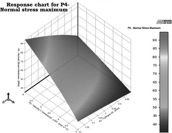La figura 4 muestra una de las superficies de respuesta que se obtuvo al parametrizar el diámetro y la velocidad para el modelo de una esfera. En esta se observa el efecto que tienen sobre el esfuerzo normal; a su vez, se generó un modelo matemático susceptible de optimizar.