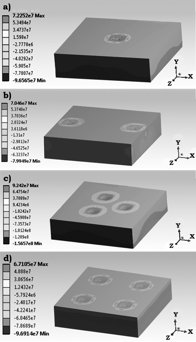 Los resultados de los esfuerzos para el modelo con cuatro esferas se presentan en la figura 5d. En este caso, el esfuerzo de compresión máximo fue de –96.914 MPa y de 67.105 MPa para el de tensión; se aprecia, además, una distribución uniforme de estos esfuerzos en el área circundante al impacto. La deformación plástica generada se muestra en la figura 6d, donde, además, se advierte una mejor distribución de la superficie deformada después del impacto de las esferas. El valor máximo reportado es de 0.084.