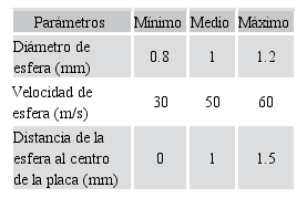 En la tabla 2 se muestran las variables elegidas a cambiar en las diferentes configuraciones modeladas: diámetro de esfera, su velocidad de impacto y su distancia al centro de la placa.