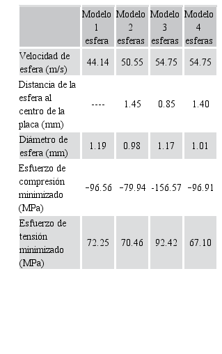 Para cada arreglo de esferas se obtuvieron inicialmente las superficies de respuesta, a partir de las cuales el programa generó las tablas de optimización que permitieron reducir el esfuerzo de tensión presente en la placa a un valor cero y aumentar el valor del esfuerzo de compresión. En la tabla 3 se presentan los valores que se aplicaron en los modelos de 1, 2, 3 y 4 esferas para la optimización de los esfuerzos mencionados.