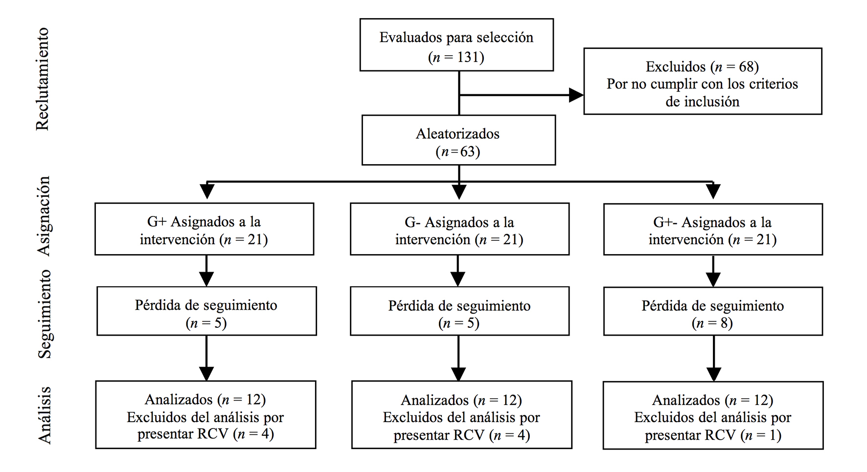 1) Reclutamiento y aleatorización de las participantes. El reclutamiento se llevó a cabo repartiendo folletos y pegando carteles en el campus del área de la salud. Conforme las participantes llegaron al laboratorio de ejercicio cardiovascular, se asignaron de forma aleatoria a los grupos por técnica de bloques de cuatro a través de una tabla de números aleatorios. El procedimiento fue cegado, tanto la aleatorización como la asignación a los grupos la realizaron diferentes investigadores para evitar el sesgo. Mientras el primer investigador designaba a las participantes un número aleatorio, el segundo investigador les asignaba un grupo; el primero, desconocía el número que correspondía a cualquiera de los tres grupos.