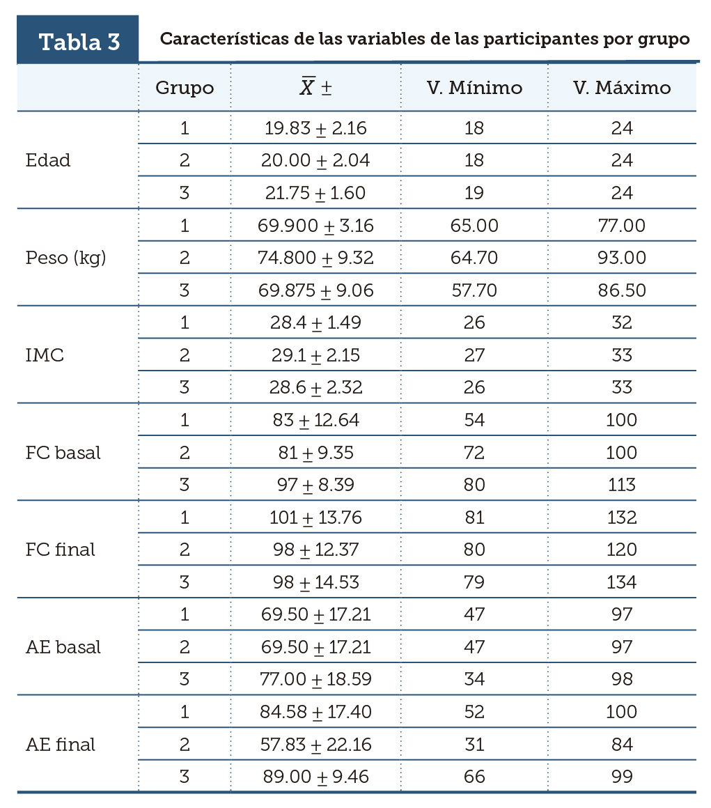 Las características antropométricas de los tres grupos y la AE basal mostraron ser equivalentes, dado que no mostraron diferencias estadísticamente significativas para poder realizar contrastaciones en grupos paralelos bajo un modelo test, re-test.