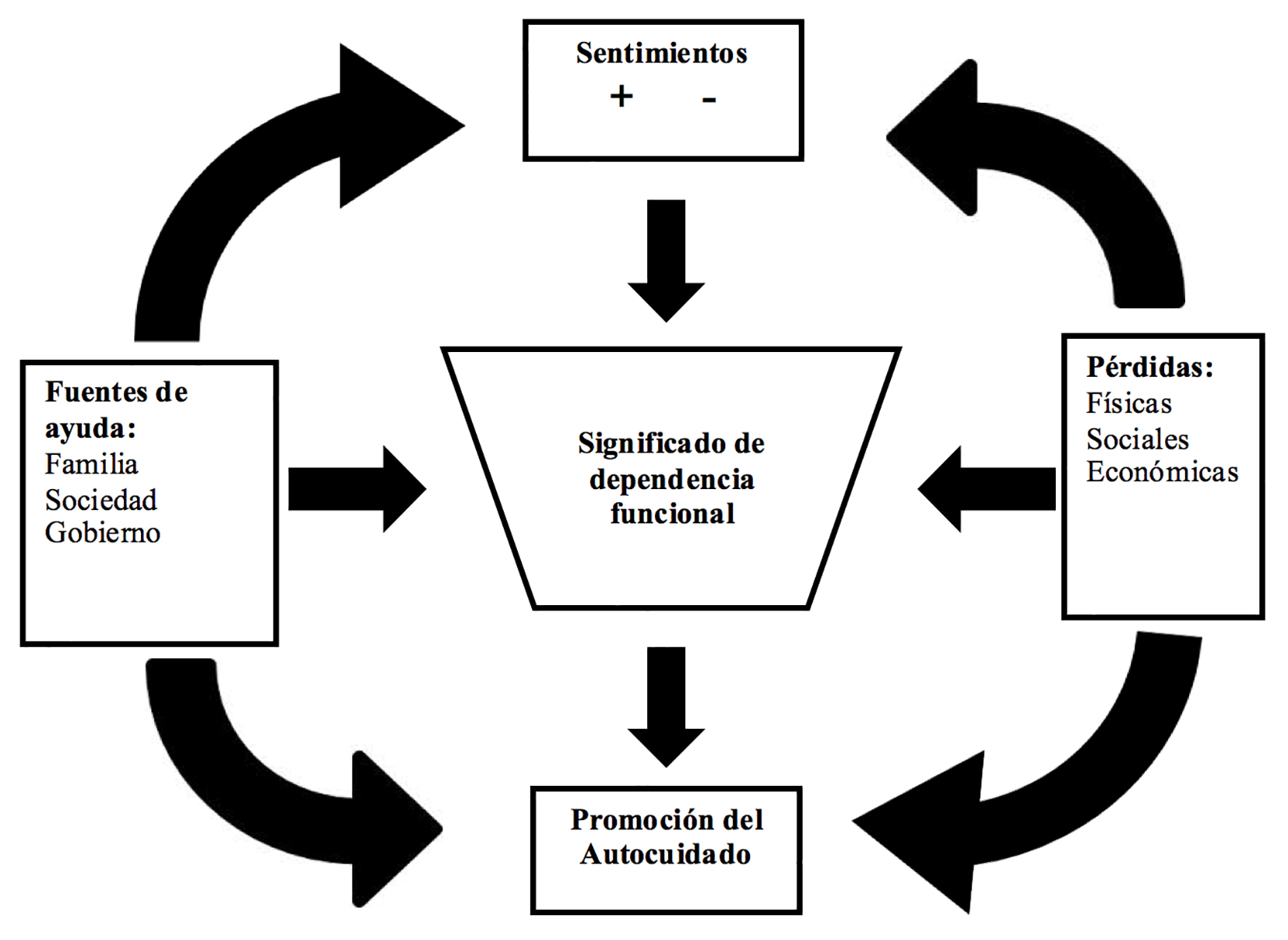 Los factores presentes en la construcción del significado de dependencia funcional en los adultos mayores se presentan en la figura 1, donde se puede apreciar que el significado de dependencia funcional en los adultos mayores está determinado por perdidas físicas, sociales y económicas, así como de las fuentes de ayuda. A su vez, las perdidas y ayuda generan sentimientos negativos o positivos, como resultado final surge la promoción para el autocuidado.