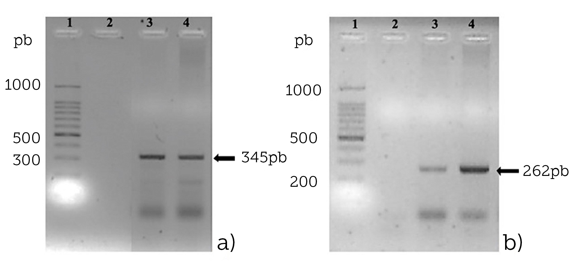 Productos de amplificación por PCR del gen 16S rRNA para Ehrlichia spp. a) y A. phagocytophilum b): 1) Marcador de peso molecular de 100 pb, 2) control negativo, 3) control positivo, 4) muestra problema DNA de un grupo de garrapatas.