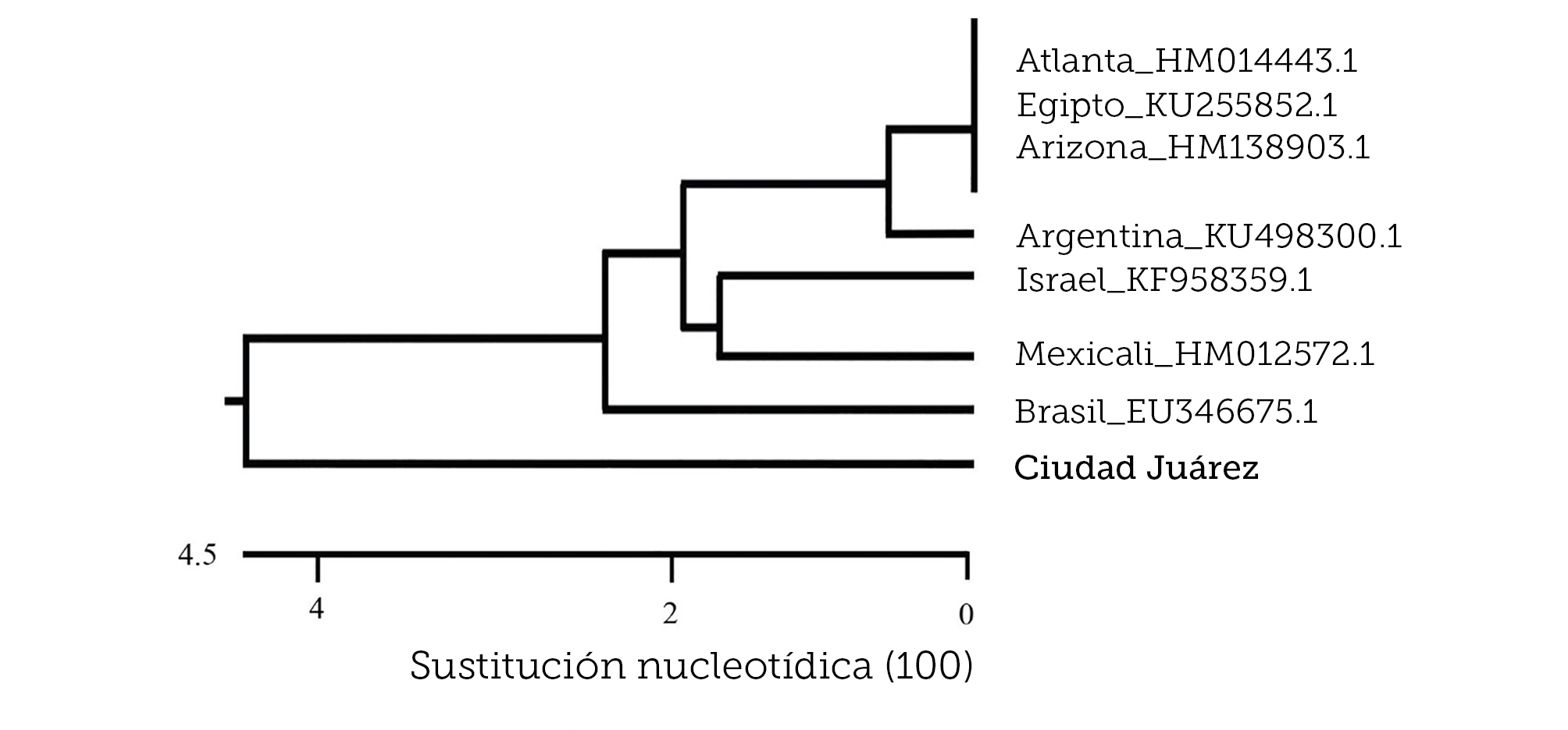 Para confirmar el linaje de las garrapatas identificadas en el presente trabajo, fragmentos del gen mitocondrial 12S rRNA fueron amplificados y secuenciados, las secuencias obtenidas en la zona de muestreo (Ciudad Juárez, México) fueron comparadas con otras reportadas y descritas en GenBank procedentes de: Mexicali, BC (HM_012572.1), así como los reportados en otros países: Israel (KF_958359.1), Argentina (KU_498300.1), Brasil (EU_346675.1), Egipto (KU_255852.1), Estados Unidos; Atlanta (HM_014443.1) y Arizona (HM_138903.1). Los resultados de secuenciación mostraron por Basic Local Alignment Search Tool nucleotide (BLASTn) una similitud del 90% y 95% con las secuencias ya reportadas, al realizar el análisis taxonómico se pude apreciar que todas corresponden al mismo linaje dado que comparten el mismo clado (figura 2).