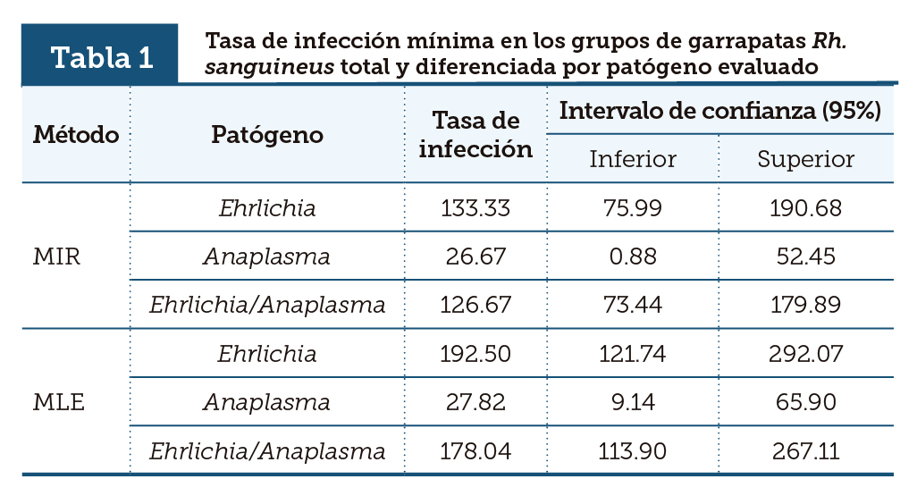 Con respecto al cálculo de la tasa de infección mínima en garrapatas, no existen muchos ejemplos en la literatura científica. Moncayo et al. (2010) muestran lo obtenido en 327 ejemplares de A. americanum agrupados en 30 conjuntos y evaluados por PCR para la detección de R. rickettsii con un MIR que varió de 35.09 hasta 153.85 con un valor general de 85.63 valor muy por debajo del estimado en el presente trabajo.