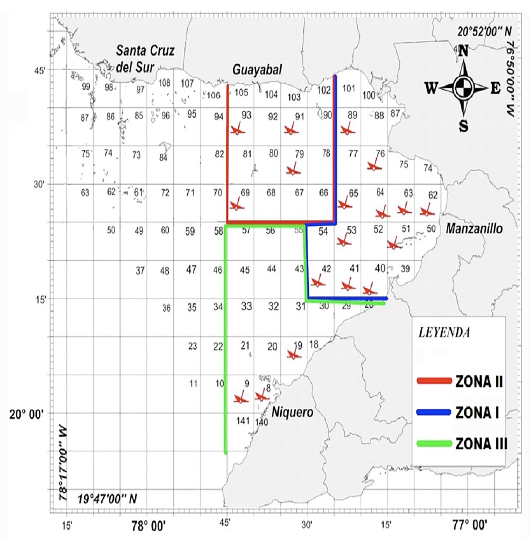 Los muestreos se realizaron aleatoriamente en los cruceros de prospección mensuales por la Empresa Pesquera Industrial de Granma (Epigran) perteneciente al Minal en el período 2010-2013 en el golfo de Guacanayabo que se encuentra en la parte oriental de la plataforma suroriental de Cuba en 20°30 'N 77 °30 'O. Se muestrearon un total de 18 cuadrículas de la red de estaciones de las tres zonas de pesca de camarón rosado en este Golfo perteneciendo 11 de la Zona de pesca I, cuatro de la Zona de pesca II y tres de la Zona III, las cuales se encuentran representadas por las embarcaciones como se muestra en la figura 1. Los muestreos se realizaron mediante arrastres durante una hora a una velocidad promedio de 3 nudos.