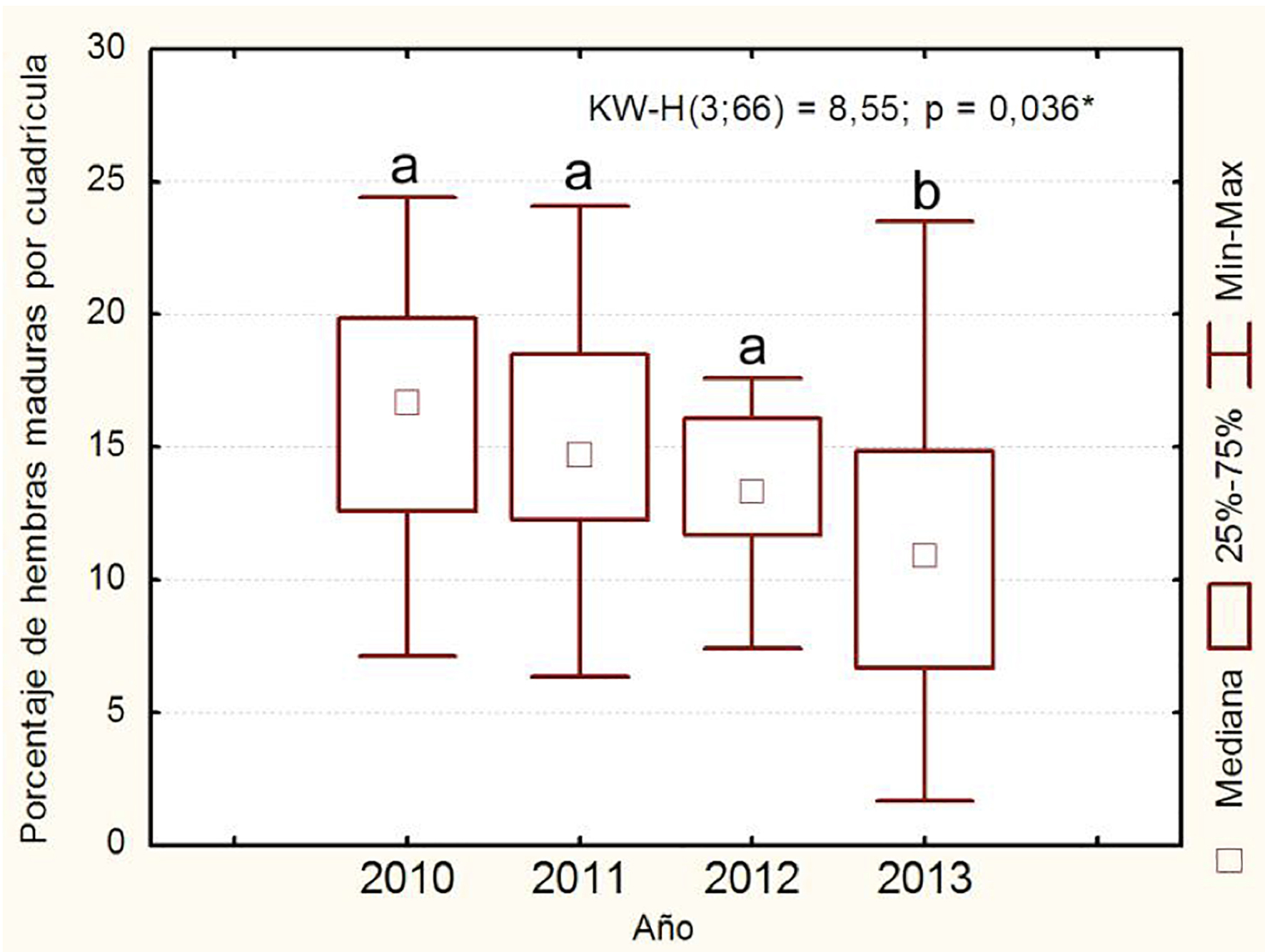 Las pruebas estadísticas se ejecutaron en el programa STATISTICA® para Windows, versión 7.0 (2002). Se comprobó la normalidad mediante la prueba de Shapiro Wilk´s y la homogeneidad de varianza mediante la prueba de Levene y al no cumplirse las premisas de normalidad en todos los casos, se procedió a aplicar estadística no paramétrica. Se utilizó la prueba de Kruskal-Wallis para determinar diferencias entre los años de muestreo en cuanto el porcentaje de hembras maduras por cuadrícula de 2010 a 2013.