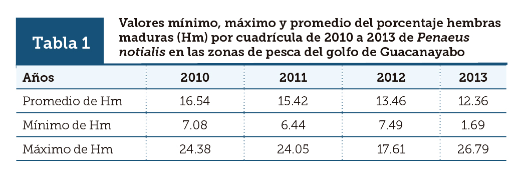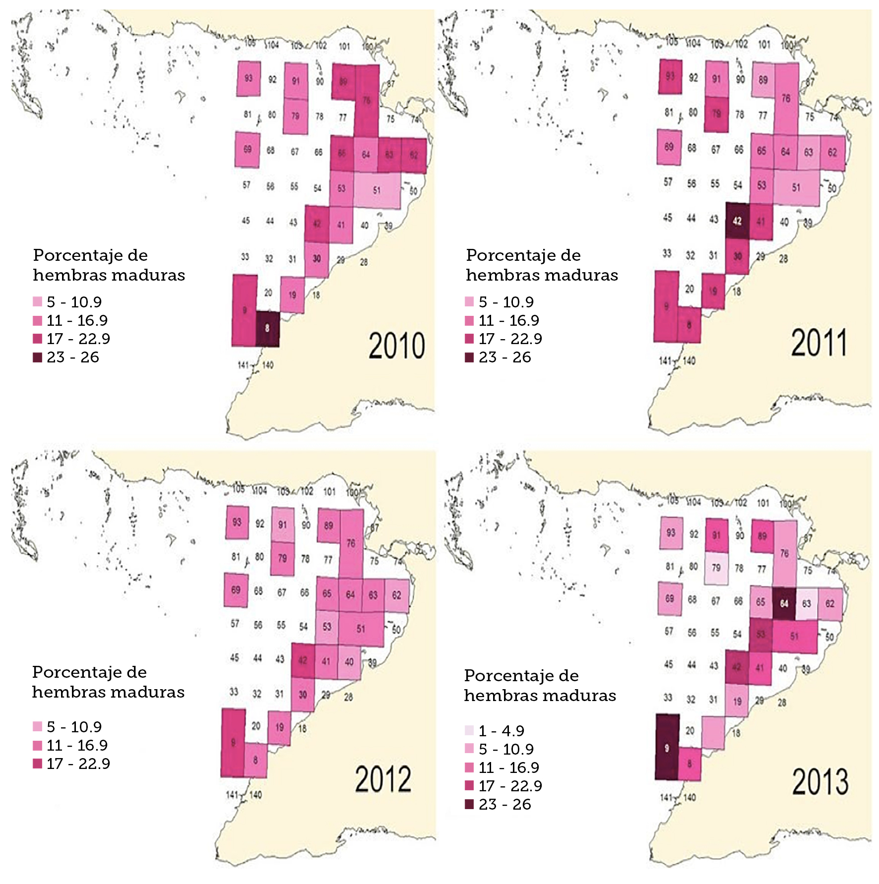 La distribución temporal del desove de los años 2010 a 2013 mostró que el porcentaje de hembras maduras por cuadrícula de pesca osciló de 1.69% a 26%, 79% de maduración. El año 2010 presentó un valor promedio de 16.54% de hembras maduras, en 2011 fue de 15.42%, en 2012 se observó con 13.46% y en 2013 se obtuvo un 12.36% de maduración (tabla 1).