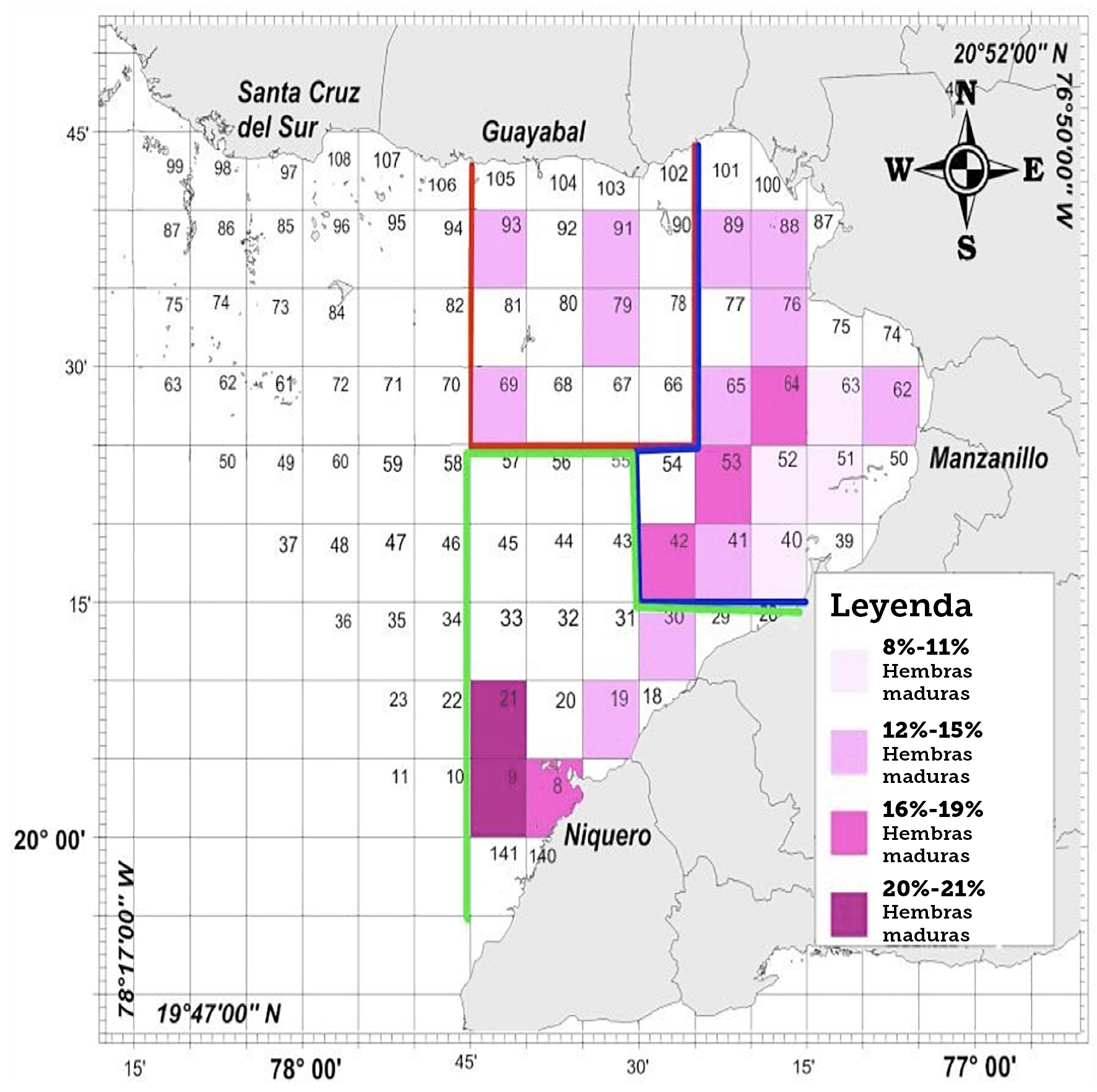 Se determinó el porcentaje de las hembras maduras por cuadrícula en las tres zonas de pesca del golfo de Guacanayabo para los años 2010 al 2013, tomando en consideración el total de hembras (maduras e inmaduras) y el total de hembras maduras (estadios III-IV). Para graficar la distribución espacial del desove de la región de los años 2010 al 2013 y para todo el período 2010-2013 se utilizó el Sistema de Información Geográfica Mapinfo (12.0). Los porcentajes se mostraron mediante una escala cromática donde el color más claro correspondió al menor porcentaje de hembras maduras y el más oscuro al máximo.