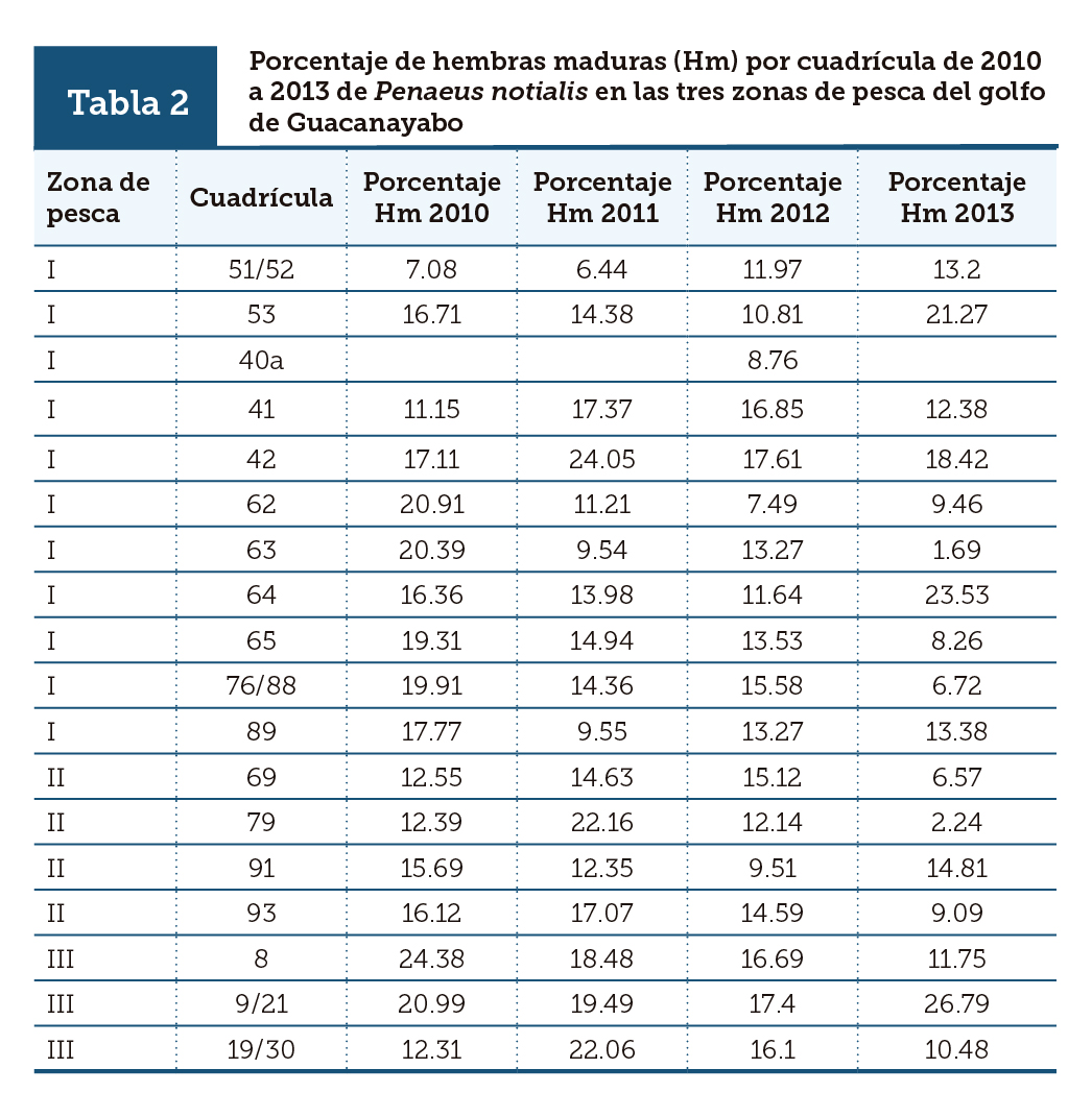 Se esperaba que la disminución de la abundancia de la población de Penaeus notialis en el golfo de Guacanayabo (Font et al., 2008) estuviera relacionada con fallos en el proceso reproductivo. El golfo se ha visto afectado en cuanto a la proporción de hembras maduras, que es baja, sin embargo, la distribución de las hembras maduras en la región se mantiene en las mismas áreas de desove. De esta situación se puede derivar que la reproducción de la especie está parcialmente afectada pero se supone que existen además, eventos que influyen de manera negativa en las etapas del ciclo de vida posteriores al desove.