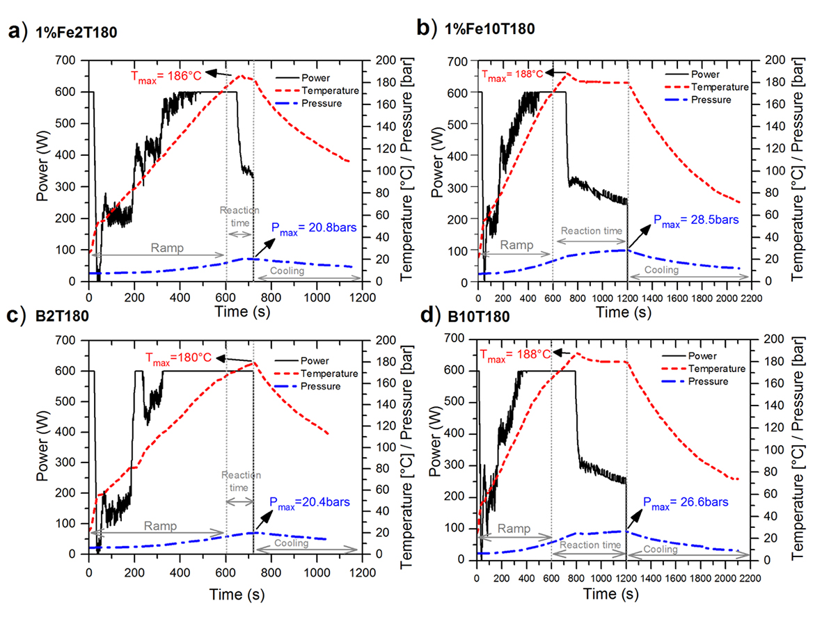 Conditions of temperature, pressure and power within the microwave reactor; a) photocatalyst 1%Fe2T180, b) photocatalyst 1%Fe10T180, C) photocatalyst B2T180 and d) photocatalyst B10T180.