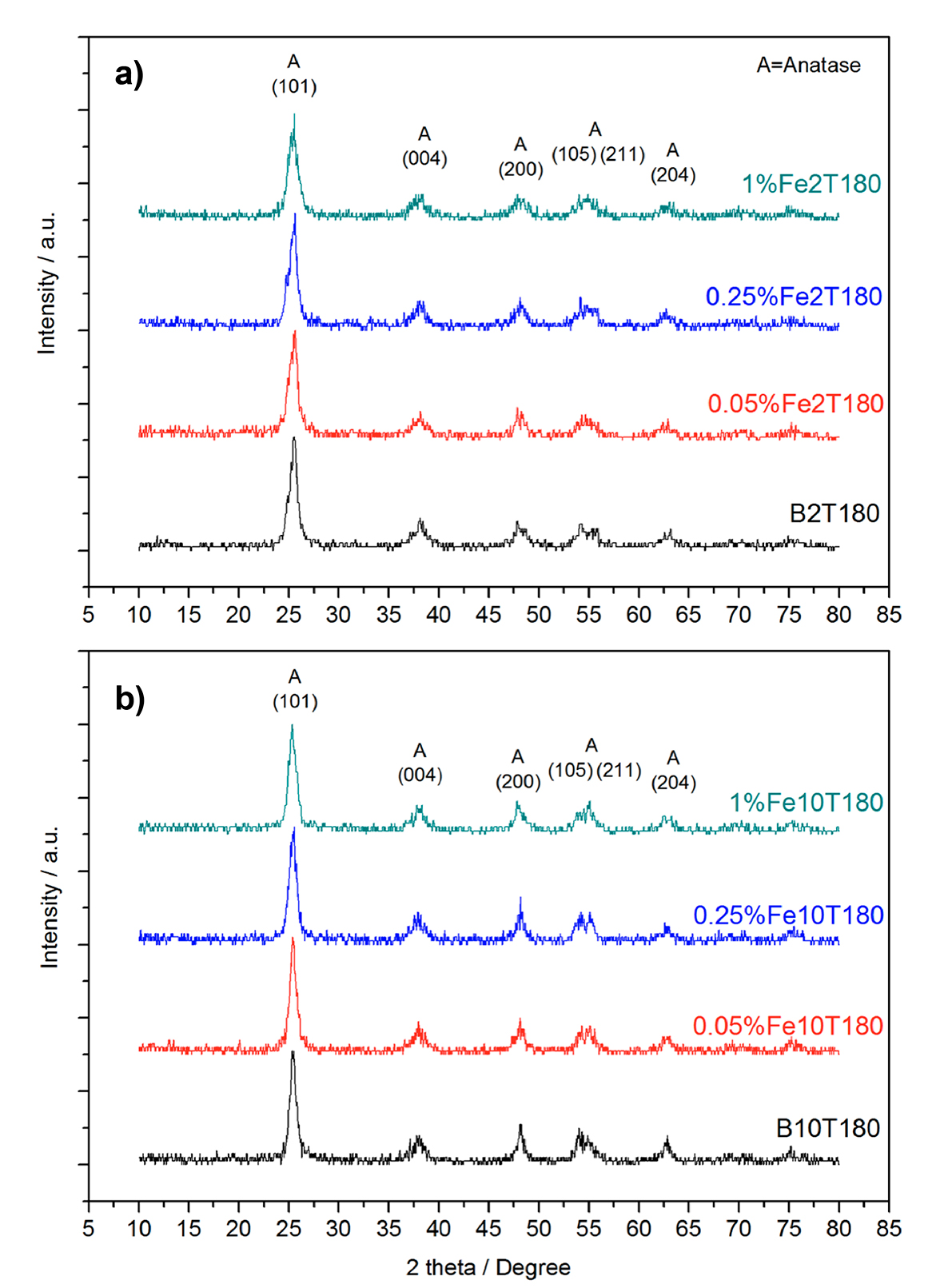 Figure 5 shows diffuse reflectance spectra of synthesized compounds at 2 min and 10 min of reaction, a) and b), respectively, at the different percentages of iron (0%, 0.05%, 0.25%, and 1% iron). It is observed that these mostly absorb the ultraviolet region and decreasing the intensity of absorbance as it approaches to the visible region. For undoped compounds, B2T180 and B10T180 have a small intensity of absorbance in the visible spectrum at 400 nm wavelength, which decreases from 0 nm to 440 nm, about 0.05% iron doped compound (0.05%Fe2T180 and 0.05%Fe10T180). They have a small visible absorbance at 400 nm, which decreases from 0 nm to 460 nm range, with a slight shift to longer wavelengths (red shift). The 0.25% iron doped compound (0.25%Fe2T180 and 0.25%Fe10T180) and 1% iron (1%Fe2T180 and 1%Fe10T180) show an even greater shift of the visible absorption spectrum as these have a higher absorbance in the range from 400 nm to 600 nm wavelength. Pang & Abdullah (2012) disclose that these changes in the electronic structure are indeed due the introduction of Fe+3 TiO2 network.