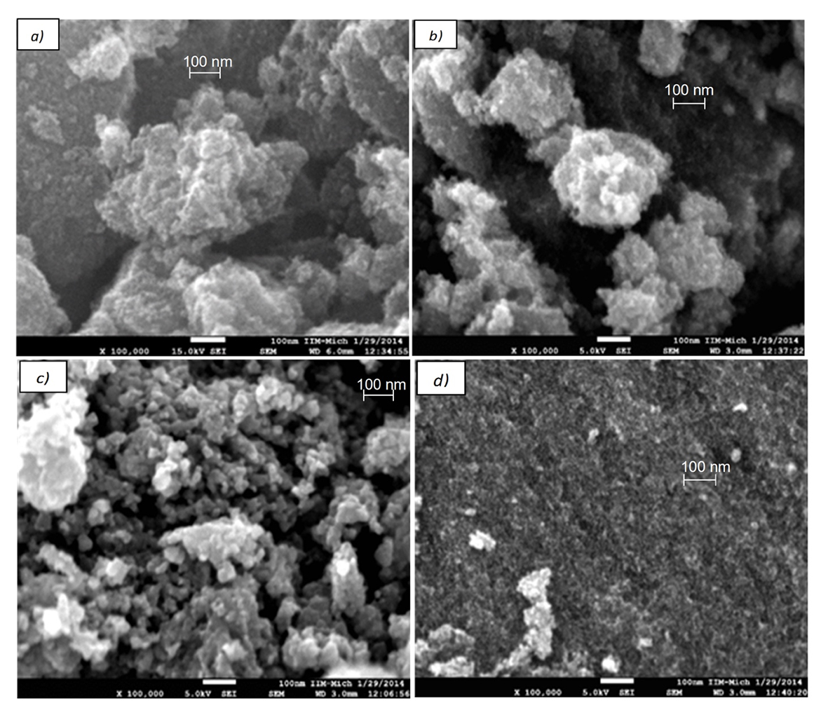 SEM micrographs to 100,000X resolution: a) photocatalyst B10T180, b) photocatalyst B2T180, C) photocatalyst 1%Fe10T180 and d) photocatalyst 1%Fe2T180.