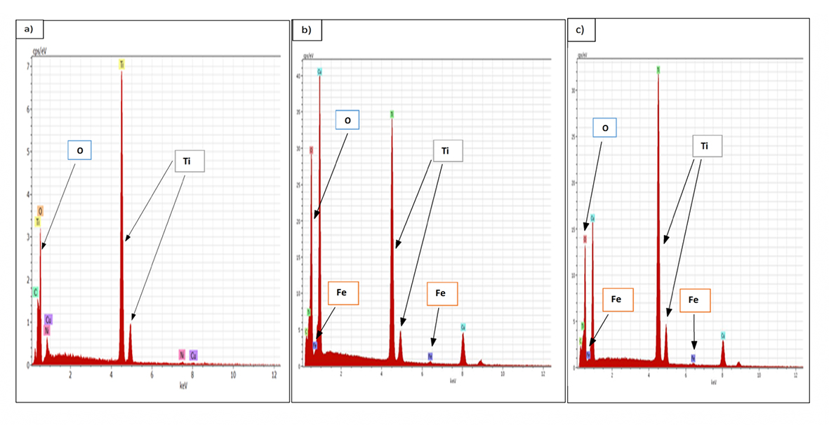 Source: Author’s own elaboration.Figure 4 shows EDS images of the compounds B2T180 (subsection a), 1%Fe2T180 (subsection b), and 1%Fe10T180 (subsection c), where it is observed that peaks for compound B2T180 are about 0.4 keV, 4.5 keV to 5 keV, corresponding to the titanium atoms which are located in both the lattice and on the TiO2 surface and a peak around 0.5 keV, which correspond to the oxygen atom of the crystal lattice of TiO2. In the case of compound 1%Fe2T180 and 1% Fe10T180, as well as B2T180, the corresponding peak to titanium and oxygen are present. Additionally, these peaks are obtained at 6.4 keV and 0.75 keV, corresponding to the iron atoms which are observed located on the surface of TiO2. These iron peaks are observed at a low proportion due to low amount of iron that was used for doping (1% iron); the latter results confirm the existence of Fe atoms for compounds doped 1% iron; however, patterns in XRD (figure 2) show no peaks related to Fe. Likewise, it is possible to observe images representative of peaks of copper, nickel, and carbon due to sample preparation, as this was fixed with a carbon-based resin and the sample holder used was made of an alloy taining copper and nickel.