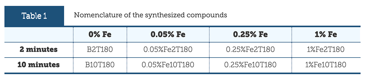The synthesis was performed in a microwave reactor (brand Anton Paar model Synthos 3000), with a power of 600 W. The process started with the mixture of reagents. For the case of undoped TiO2, ethyl alcohol (industrial 75%), titanium butoxide (Aldrich brand Sigma 97% purity), and deionized water were used, while for the TiO2-Fe, in addition to the above reagents, Fe(NO3)39H2O solution (brand Golden Bell analytical reagent grade ACS) was added as a precursor of the doping agent. Subsequently, each prepared mixture was introduced in the microwave reactor, where the temperature and the reaction time were set. The suspension obtained was subjected to drying in an oven (Brand Felissa) at 100 °C for 18 h. Then a grinding process was experienced to obtain powders of less than 130ASTM mesh size. Each synthetized material underwent a heat treatment at 500 °C for one hour. The synthesis was performed at 180 °C. The effect of doping with iron was assessed by varying the weight percentage of Fe at 0%, 0.05%, 0.25%, and 1%. The effect of synthesis time in the reactor was evaluated at 2 min and 10 min after the heating ramp of 10 min. The experimental design is shown in table 1, where the intersection of the percentage of iron and the reaction time gives the compound synthesized.