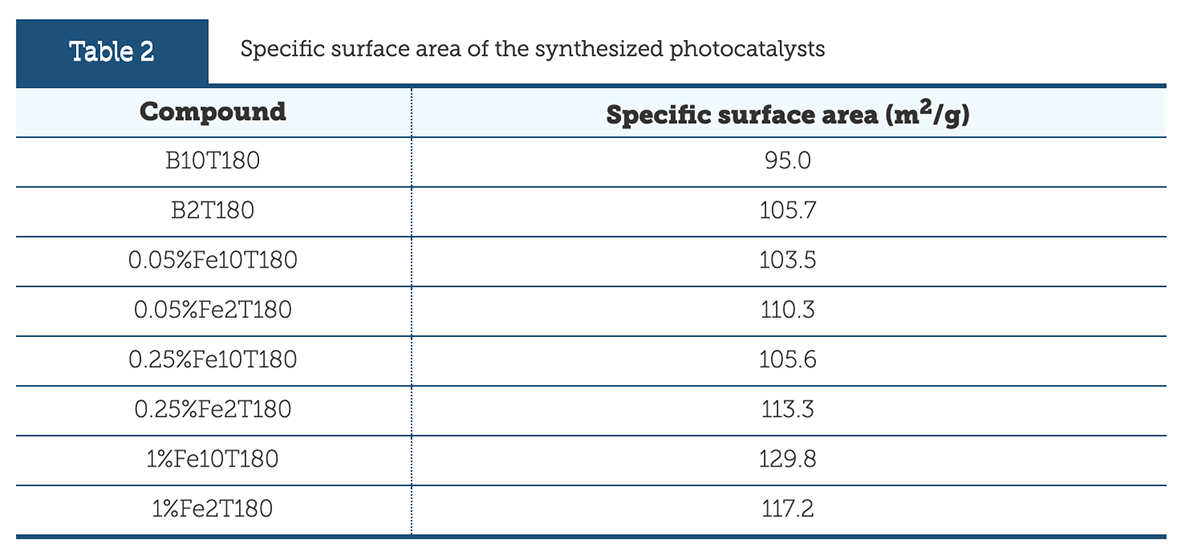 The values of BET of the synthesized photocatalysts are shown in table 2. It was observed that the introduction of iron caused an increase in the surface area. The doping of iron ions within the range of suitable concentration can lead to an increase in surface area because, with this doping, agglomeration of particles and form nanocrystalline powders with high surface can be prevented (Asiltür, Sayllkan & Arpaḉ, 2009; Song, Jun, Chen & Jianjun, 2011). It is noted that, in all compounds synthesized at 10 min reactions, there was a slight increase in BET as the amount of iron introduced is increased, taking a difference between the undoped compound and 1% iron doped compound of 12.5 m2g-1.