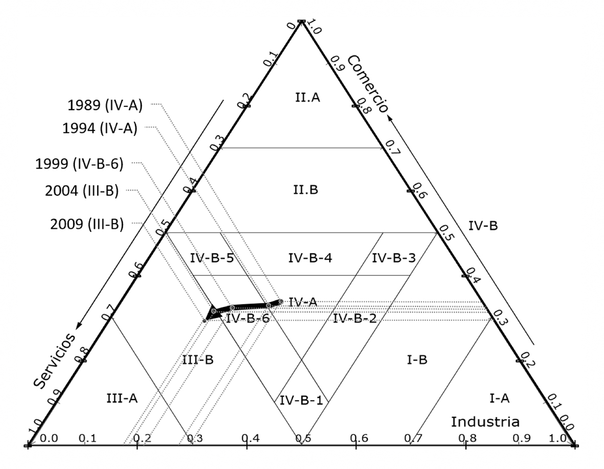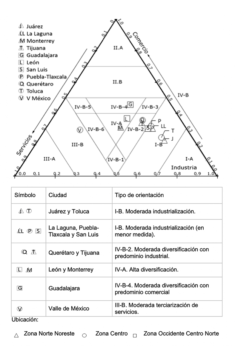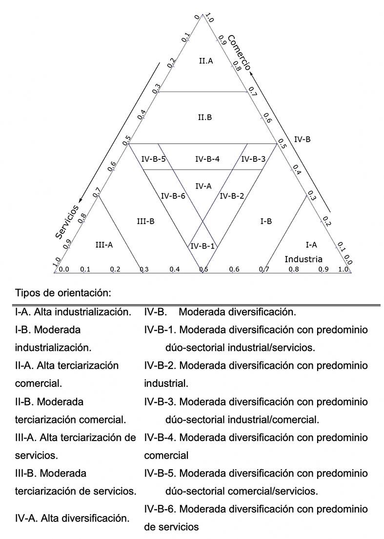 Los resultados obtenidos permiten identificar la significancia relativa de cada zona metropolitana. Sin embargo, para clasificar jerárquicamente la especialización por zona metropolitana, identificar trayectorias y observar concretamente parte de la estructura económica, se emplean diagramas de coordenadas triangulares o también llamados diagramas ternarios de orientación sectorial con intervalos definidos, los cuales se caracterizan generalmente por dividir en escala de proporción la superficie triangular donde han de representarse los datos, según sean los valores de los tres elementos empleados, de forma tal que permiten un fácil manejo técnico e interpretativo (figura 1).