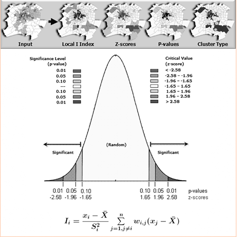Esta técnica permite identificar puntos calientes, puntos fríos, clúster y valores atípicos espaciales estadísticamente significativos, producto de la estadística de I Anselin local de Moran, que forma parte de las herramientas de estadística espacial del software ArcGis 10.1, empleado en esta investigación (figura 2).