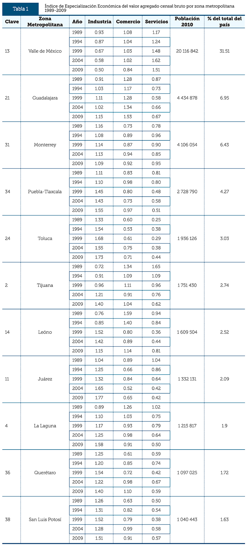 En efecto, y sin más preámbulos, al aplicar metódicamente el IEE al valor agregado censal bruto durante el periodo de 1989-2009 se logra identificar entre las principales zonas metropolitanas del país con más de un millón de habitantes a la zona metropolitana más relevante del proceso de terciarización, la cual es el Valle de México, misma que, debido a su concentración poblacional, presenta el 1.51 de IEE orientado a los servicios y un 0.84 al comercio en valor agregado censal bruto durante el 2009, mientras que Guadalajara presenta el 1.53 de IEE orientado al comercio y 0.67 a los servicios para el mismo año, diferencia a destacar por el momento y que posteriormente se detalla (tabla 1).