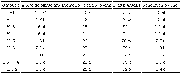 El comportamiento de los genotipos evaluados presentó una diferencia significativa de acuerdo con el análisis de varianza (p ≤ 1%). Se constituyeron tres grupos en cuanto a ciclo vegetativo: el grupo 1 integrado por el testigo TECMON-2, el cual presentó la mayor precocidad (62 días) y estadísticamente diferente al resto de los genotipos (Tukey, p ≤ 5%); el grupo intermedio formado por los híbridos H-7, H-3 y H-6 junto con el testigo DO-704, con 68 y 69 días respectivamente; y los híbridos tardíos H-1, H-2, H-4 y H-5 con 70 y 72 días (Tabla 2).