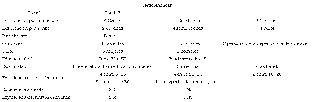 Dentro de las características del contexto que dan origen a esta representación social se encuentra que estos docentes tienen entre 35 y 45 años de edad, y entre 12 y 21 años de experiencia frente a grupo. Dos cuentan con maestría en educación y dos con licenciatura en educación primaria. Tres refieren no tener experiencia agrícola, y solo una dice ser de familia campesina, pero ella ya no se dedicó al campo. Respecto a las experiencias previas en huertos escolares, tres dicen haberlos trabajado en el ciclo escolar 2018-2019 a raíz de la Autonomía Curricular y uno señala que no tenía experiencias previas y que lo implementó a partir del ciclo 2019-2020 por invitación de la instancia gubernamental de educación.