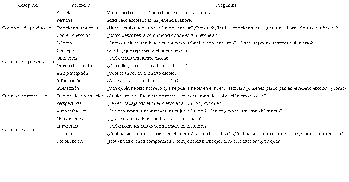 La información recabada en los conversatorios, la observación participante y las entrevistas se transcribió y se sistematizó para su análisis, el cual consistió en la codificación de los datos para identificar conocimientos, opiniones, percepciones, informaciones, creencias, perspectivas y actitudes (Moscovici, 1961) sobre los huertos escolares. También se codificó con base en las experiencias, las actividades desarrolladas, las interacciones con otras personas, los medios de información consultados y la influencia del contexto social, político, histórico y cultural (Jodelet, 2018). Las codificaciones se agruparon en las cuatro categorías que guiaban el estudio, a saber: campo de representación, campo de información, campo de actitud y contextos de producción de las representaciones (Cuevas, 2016).
