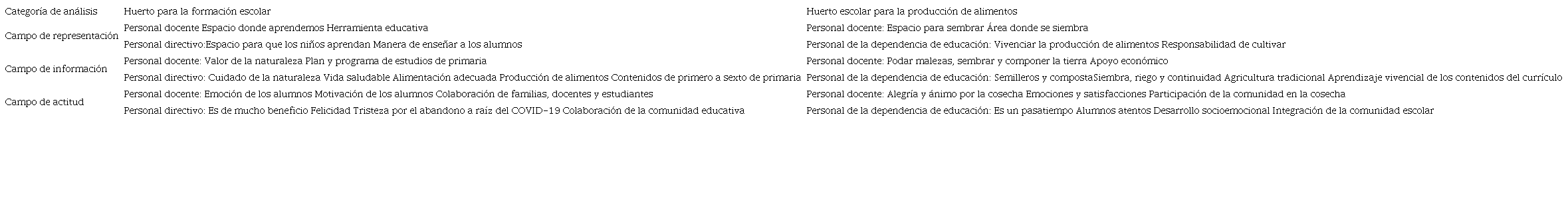 La investigación muestra dos representaciones sociales de huertos escolares, una asociada a la formación escolar y otra a la producción de alimentos (Tabla 4). La primera estuvo presente en un total de nueve personas (cinco directores y cuatro docentes), mientras que a la segunda la conforman cinco personas (las tres personas de la dependencia de educación y dos docentes). Cabe mencionar que, a pesar de que los huertos son representados de manera distinta, hay algunos elementos en común entre los campos de información y actitud de ambas representaciones, cuestión que se detalla más adelante