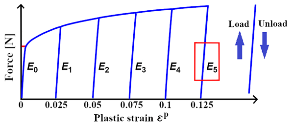 The evolution of the Young’s modulus with the increasing plastic strain ƐP were determined from the loading-unloading-reloading experimental sequence under uniaxial stress state, as illustrated in Figure 4. The experiments were conducted under strain control up to a plastic strain of 0.125. After the experiment, the instantaneous Young’s modulus E0 to E5, corresponding to each plastic strain increment (i.e., 0.025, 0.05, 0.075, 0.10, and 0.125), were calculated. To describe the evolution of the Young’s modulus, equation 3 proposed by Yoshida was used (Yoshida & Uemori, 2002; Yoshida et al., 2002):