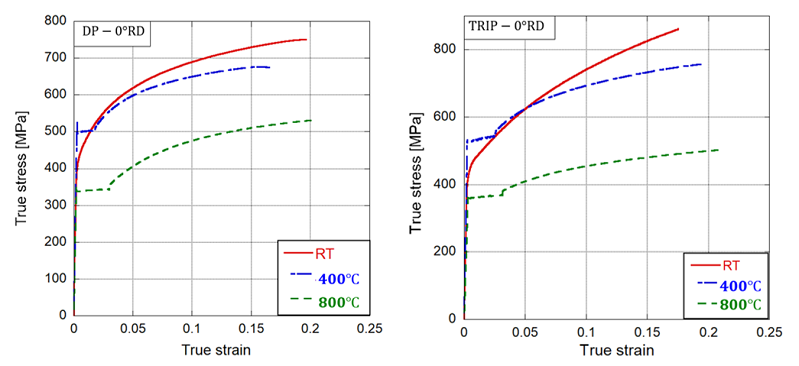 The comparative analysis of the experimental results is presented in this section. First, the true stress vs. true strain curves determined from the uniaxial tensile test in the 0° rolling direction at room temperature (RT) and annealing temperature are presented in Figure 5a and 5b for the DP and TRIP sheets, respectively. It can be observed that the stress-strain curve at room temperature for both materials exhibit a smooth transition from the elastic to the plastic deformation zone. However, a clear yield plateau is observed in the specimens with the intermediate annealing process. This behavior is related to the generation of dislocations in the grain boundaries, as reported by Le et al. (2017). Also, it can be observed that the yield stress σY is strongly influenced by the annealing temperature. The initial yield stress for the virgin specimen is σY = 440MPα. On one hand, the specimens subjected to 400 oC exhibit higher yield stress with value σY = 502MPα and a clear yield plateau. On the other hand, the specimens under a heat treatment of 800 oC exhibit lower yield stress with σY = 325MPα. This behavior is related to the recrystallization of the material with the elevated temperature, reducing its strength. Also, the work-hardening behavior is influenced by the annealing process. Here, the 800°C stress-strain curves show a reduced work-hardening of the material, exhibiting almost a linear behavior. Hence, the annealing temperature can be considered as a process to modify the mechanical properties of the sheet depending on the applications. Finally, it can be observed that the uniform elongation of the sheet is increased with the annealing temperature. This is related to the grain refinement obtained with the annealing temperature. Table 1 lists the summary of the experimental results in terms of the yield stress σY, tensile stress σUT, and percentage of elongation %El.