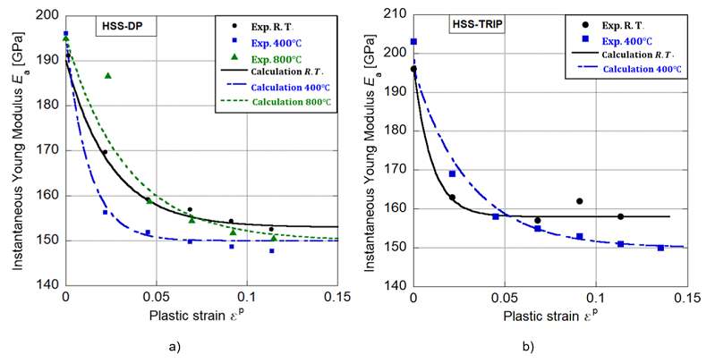 From the loading-unloading-reloading experimental sequence, the Young’s modulus variation with the increasing plastic strain ƐP is presented in Figure 7a and 7b, for the DP and TRIP sheets respectively. The Young’s modulus was determined using the 0o rolling direction specimens. First, it can be observed for the DP sheet that the initial Young’s modulus is E=195GPα for the annealed and room temperature specimen. Then, as the plastic strain increases, the Young’s modulus drastically decreases until a saturated value near to E=157GPα at ƐP=0.125 is obtained. However, for the annealed specimens at 400°C and 800°C, the Young’s modulus decreases to, E=151GPα and E=147GPα, respectively. This behavior is related to the generation of dislocations and free boundaries of the crystals. From the macroscopic perspective, this reduction in the Young’s modulus would influence the springback behavior of the material. On the other hand, for the TRIP sheet, an initial Young’s modulus E=198GPα is observed. Then, for the room temperature specimen, the material shows a clear stagnation value of E=158GPα. However, in the case of the annealing at 400 oC, the saturation of the Young’s modulus is not observed and continue decreasing with the plastic strain increments.