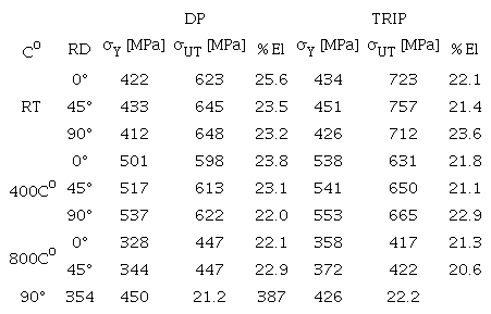The anisotropy of the sheet with the annealing process is reduced in comparison with that determined from the specimens at room temperature. The anisotropy at room temperature for the DP sheet is r0 = 0.94, r45 = 1.1 and at 800°C is r0 = 06, r45 = 0.71 and r90 = 0.84. For the TRIP sheet, the room temperature anisotropy is r0 = 0.68. r45 = 0.74 and r90 = 1.1 and at 800°C is r0 = 0.48, r45 = 0.57 and r90 = 0.72. This behavior is related to the reduction of the grain size with the increasing of the temperature, leading to a more homogeneous crystallography.