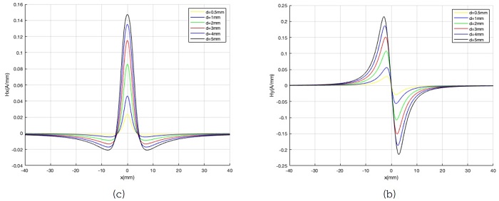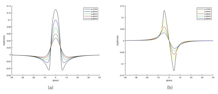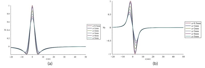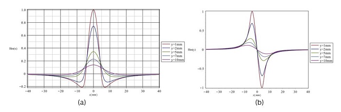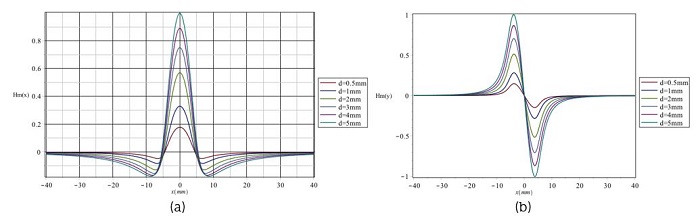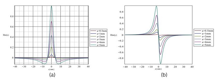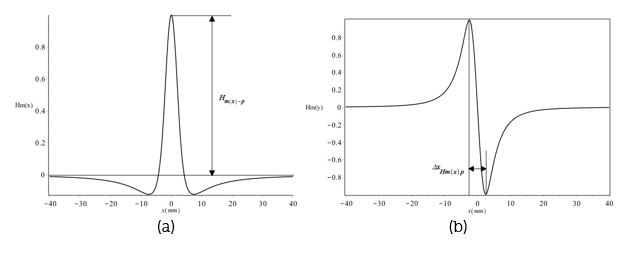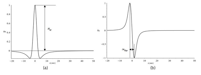 La Figura 4 muestra las distribuciones de Hm(x) y Hm(y) a lo largo de la dirección de la concentración de tensión, respectivamente, donde la anchura (α) de la zona de concentración de esfuerzos es de 5 mm, la profundidad (d) de 5 mm y el valor de elevación (y) es de 2 mm. Todos los resultados se normalizan con el valor de pico. En la Figura 4(a) se observa que Hm(x) muestra un pico en la posición máxima de concentración de la tensión denotada por Hm(x)-p para la componente tangencial, mientras que en la Figura 4(b) Hm(y) cambia su polaridad en la posición máxima de concentración de tensión. La anchura entre la cresta de onda y el valle de la componente normal se denomina ΔxHm(y)p