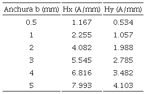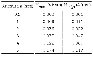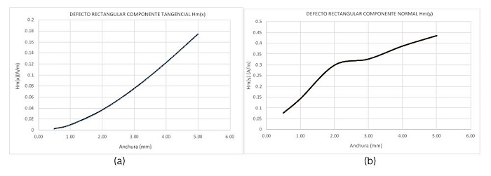 En el caso de defectos rectangulares, de las Figuras 5a y 5b se obtiene la Tabla 1 que describe la influencia cuantitativa de la variación de la anchura de la zona de concentración de esfuerzos en los parámetros característicos de la señal magnética respecto de la componente tangencial Hm(x) y la componente normal Hm(y).