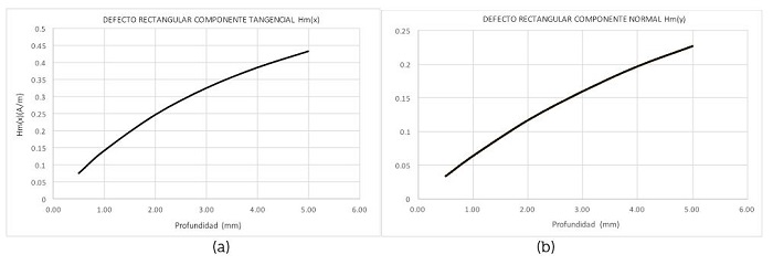 Las Figura 5 a la 7 muestran la variación de la anchura, profundidad y elevación, respectivamente, de un defecto rectangular en donde la intensidad del campo magnético tangencial varía de -0.021 a+0.174 A/mm, de -0.021 a +0.434 A/mm y de -0.124 a +0.583 A/mm, mientras que la intensidad del campo magnético normal varía de ±0.117 A/mm, (0.227 A/mm y -0.053 a +0.475 A/mm, respectivamente.