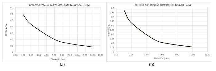 En los defectos tipo rectangulares se puede observar que la amplitud del componente tangencial y normal de las señales se incrementa con un aumento en la longitud o profundidad de SCZ. El valor de elevación es también un factor importante en las pruebas, y la amplitud disminuye rápidamente con el aumento del valor de elevación.