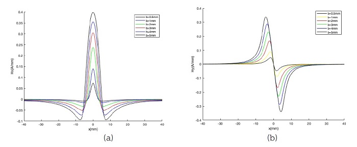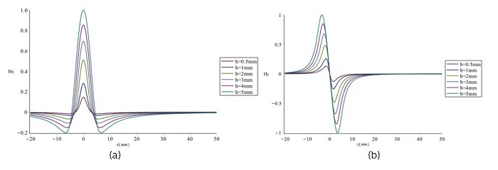 La Figura 8 muestra los componentes tangenciales (a) y normales (b) del campo magnético de fuga automática para la distorsión del campo magnético en defectos tipo V (triangulares), donde b = 3 mm e y = 2 mm. Cabe señalar que todas las coordenadas se normalizan para facilitar el posterior análisis cualitativo. Se ve claramente que las distribuciones de campo magnético en la zona de concentración de esfuerzos presentan características de señal de memoria magnética evidentes; es decir, los componentes tangenciales alcanzan su valor máximo denotado por Hxp y los componentes normales cambian su polaridad en la posición de concentración de tensión. La anchura entre la cresta de onda y el valle de la componente normal se denomina ΔxHyp.