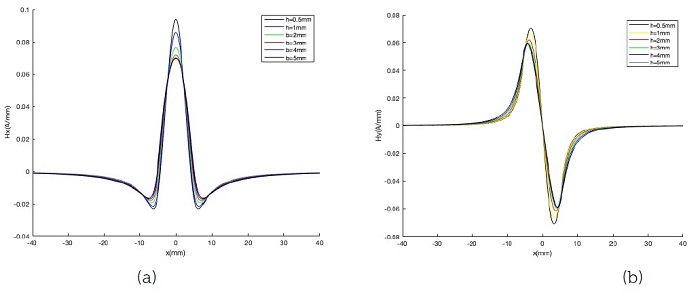 Se puede apreciar en la Figura 15 que los componentes tangencial y normal aumentan notablemente con el aumento de las anchuras de las SCZ en la posición de concentración de tensiones máximas. Mientras tanto, en la Figura 16 los valores de las componentes tangencial y normal se hacen más anchos y corresponden con la profundidad de la SCZ, que puede utilizarse para caracterizar el rango local de daño temprano. Es evidente que el valor de elevación tiene un gran efecto sobre la señal de memoria magnética, por lo que se recomienda el valor de elevación más pequeño posible como opción para obtener información del campo magnético más fuerte en aplicaciones de ingeniería.