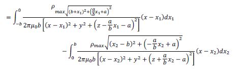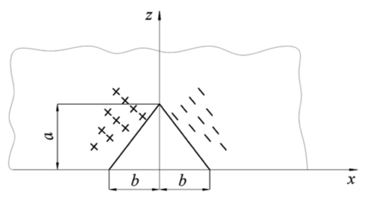 Asumiendo que la anchura y la profundidad de la muesca en V son 2𝑏 y 𝑎, respectivamente, y las densidades de carga magnética aumentan linealmente desde el borde hasta la punta de la muesca en V, la distribución de densidad de carga magnética puede obtenerse de la siguiente manera: