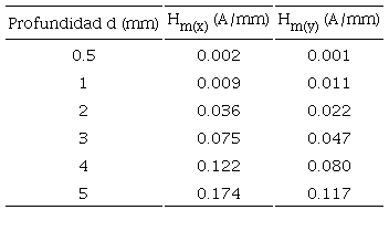 De las Figuras 6a y 6b, se obtienen los datos para la Tabla 2, la cual describe la influencia cuantitativa de la variación de la profundidad de la zona de concentración de esfuerzos en los parámetros característicos de la señal magnética con respecto a la componente tangencial Hm(x) y la componente normal Hm(y).