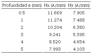 De las Figuras 10a y 10b se obtiene la Tabla 5, que describe la influencia cuantitativa de la variación de la profundidad de la zona de concentración de esfuerzos en los parámetros característicos de la señal magnética con respecto a la componente tangencial Hx y la componente normal Hy.