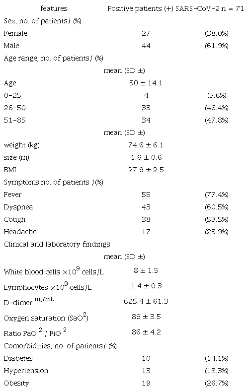 Seventy-one patients who had a positive RT-PCR test for SARS CoV-2 (44 male and 27 female patients; mean age 50 ± 14.1; range: 25-84 years) were studied. The highest proportion of patients (47.8%) was found in an age range of 51-85 years. The patients presented a mean body mass index of 27.9 kg/m2, of which 19 individuals were obese. Among the population studied, the largest proportion of patients had a history of at least one comorbidity, 13 (18.3%) suffered from systemic arterial hypertension, and 10 (14.1%) suffered from diabetes mellitus, being obesity the most frequent with 26.7%.